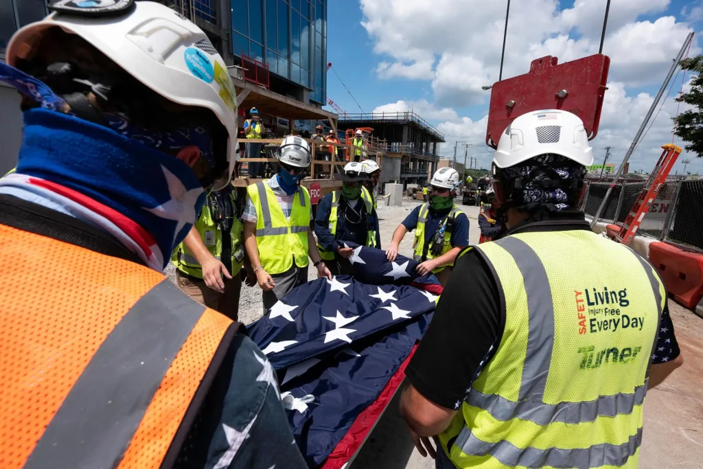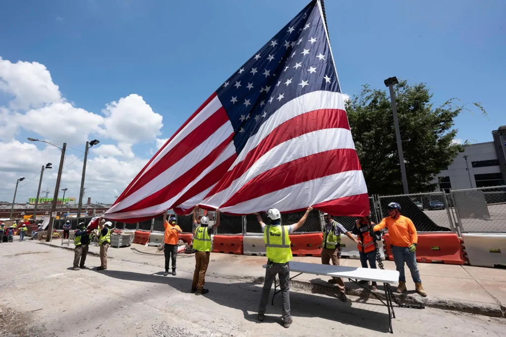 NASHVILLE, Tenn. — July 2, 2020 — Propst Development and Turner Construction topped out the Broadwest office tower today, raising an evergreen tree to the top of the 21-story structure. A large American flag, marking the Fourth of July weekend, was also unfurled and raised by a tower crane.